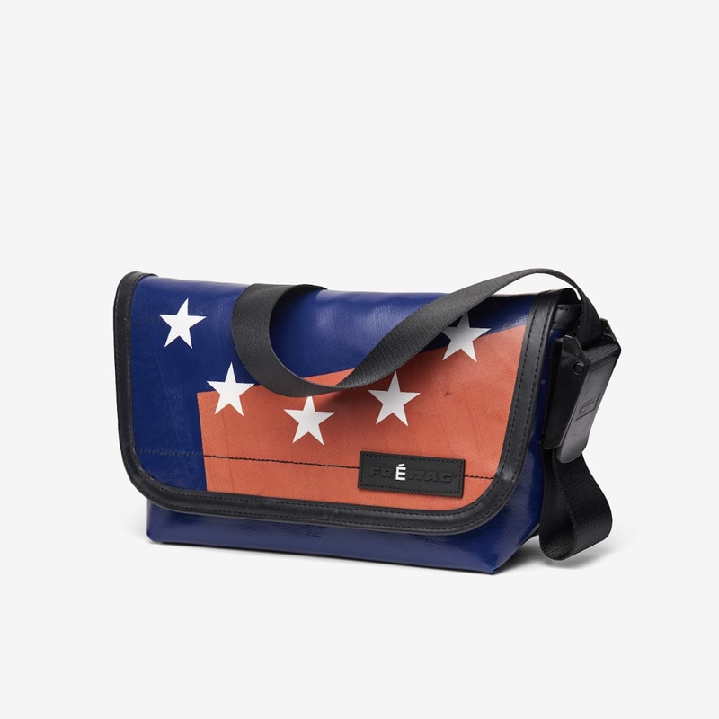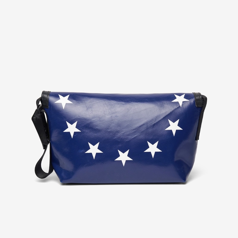 Каждая сумка в этой коллекции — уникальна. FREITAG традиционно использует старые тенты грузовиков, которые тщательно отбирают, чистят и режут вручную в Цюрихе. В этот раз они выбрали только синие оттенки — дань уважения палитре Études Studio. Затем на сумки методом трафаретной печати наносят звёзды — символ, который Études часто использует в своих коллекциях.